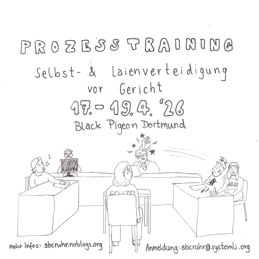 Von der Aktion über die erste Post durch den Gerichtssaal bis zum Urteil (oder sonstigem Ende des Verfahrens) wird der Gang eines Strafverfahrens erörtert – und wie mensch sich dagegen wehrt: Gesetzestexte lesen und kreativ anwenden, offensiver Umgang mit Repressionsbehörden, politische Durchführung der Hauptverhandlung und vieles mehr…